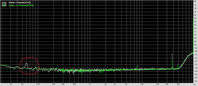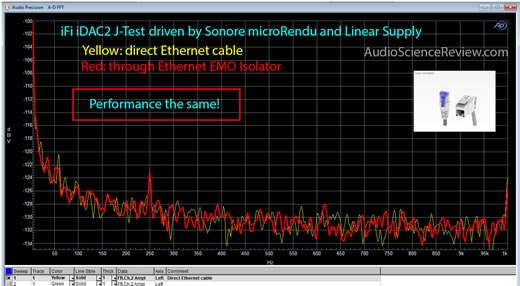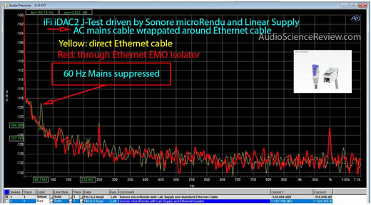 After wrapping the network cable around a powercord, he noticed that a small 60 Hz spike disappeared when using the isolator.