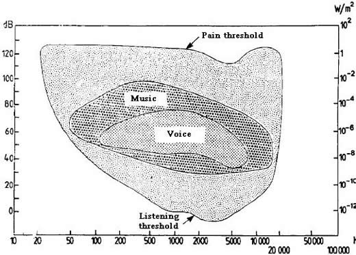 Sound is a variation in air pressure. We can detect a change of less than one billionth of standard atmospheric pressure. This is the lower threshold and corresponds to 0 decibels. Sound at 120/130 dB starts to hurt. Our dynamic range is 0 - 130 dB, a difference of 1013 =10.000.000.000.000. That's why a logarithmic scale is used.