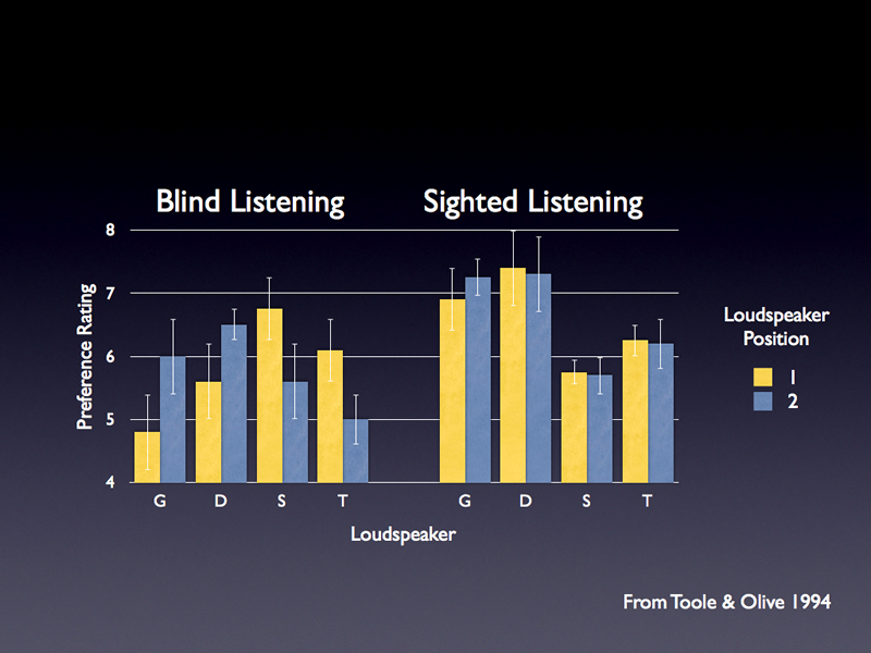 Sean Olive tested loudspeaker preferences using the same speakers in both a sighted and a unsighted test. The sighted tests produced a significant increase in preference ratings for the larger, more expensive loudspeakers