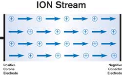 In an electrostatic air mover, the corona discharge ionizes the air around the emitting electrode. As the ions stream across an open space to an oppositely charged collector electrode, they pull other air particles with them by means of electrostatic attraction, thus creating air movement.