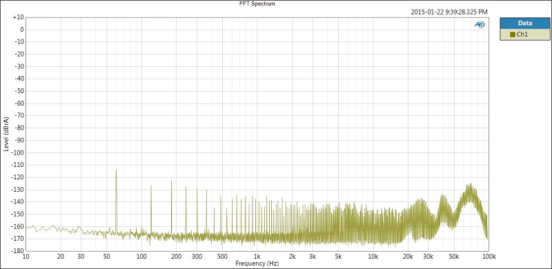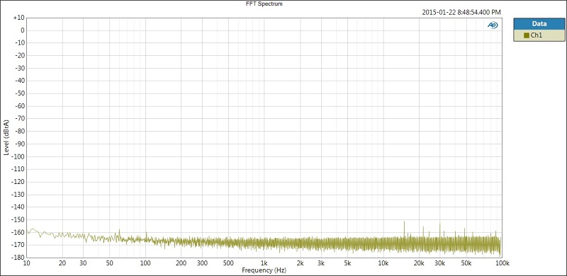 FFT spectrum (1024K points averaged 8 times) showing the noise floor measured on the e12 DAC RCA line outputs. The e12 DAC is connected with a standard USB cable to a low-cost desktop PC. The noise floor is extremely clean. There are no visible traces from the computer high-frequency noise usually transmitted via the USB connection. The power line related noise (60Hz and its harmonics) is below -157 dB (0.0000014%).