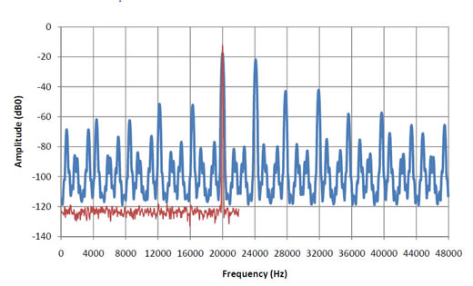 The distortion seen in this graph is solely caused by sample-rate converting from 48 kHz to 44.1 kHz. As seen in the graph, the signal-to-noise ratio went from 130 dB to less then 80 dB!