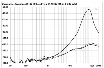 Accuphase DP-85, 1/3-octave spectrum of dithered 1kHz tone at -150dBFS, with noise and spuriae (from top to bottom): DSD data, 24-bit PCM data (right channel dashed).